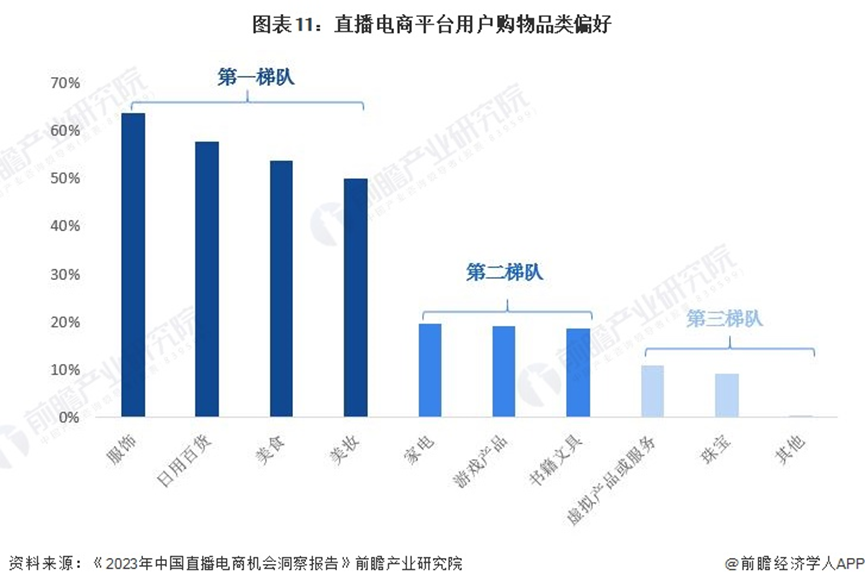 《2023年中國直播電商機會洞察報告》顯示,超50%的直播電商用戶偏好在直播電商平臺購買服飾、日用百貨、美食等產(chǎn)品。