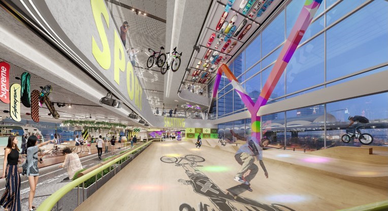 未來,12米高的透視空間將與極限運動結(jié)合,匯集時下最嗨FUN的運動諸如滑板公園等,以及零售及社區(qū)資源,打造成潮酷空間。