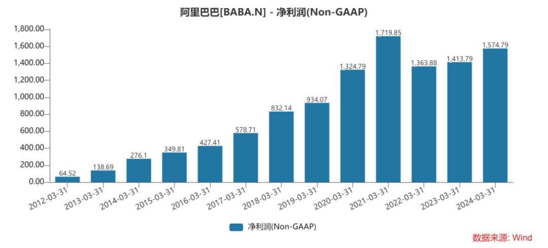 利潤(rùn)方面的表現(xiàn)來看,2024財(cái)年阿里巴巴非公認(rèn)準(zhǔn)則下的凈利潤(rùn)1,574.79億元,同比增長(zhǎng)11%;經(jīng)調(diào)整EBITA為1650.28億元,同比增長(zhǎng)12%;2024Q1非公認(rèn)準(zhǔn)則凈利潤(rùn)244.18億元,同比下降11%;經(jīng)調(diào)整EBITA 239.69億元,同比下降5%。