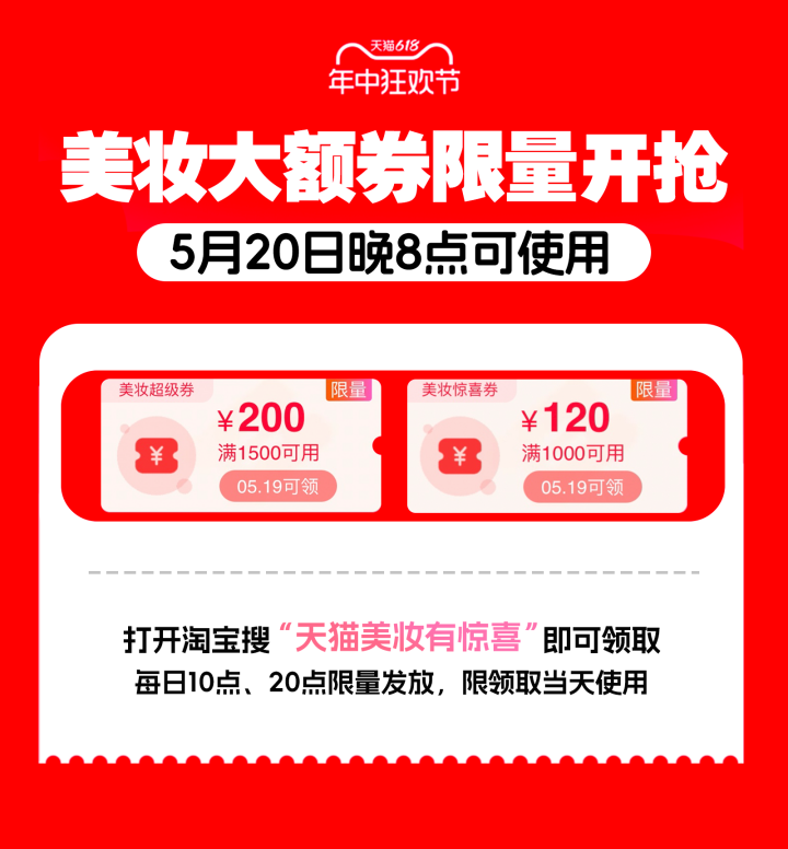 天貓618美妝大額券來了!兩張券將從5月19日上午10點(diǎn)開始,至5月28日,于每天上午10點(diǎn)及晚上8點(diǎn)限量發(fā)放,每個(gè)消費(fèi)者每天可領(lǐng)取美妝超級(jí)券、美妝驚喜券各一張,領(lǐng)完即止。每張券限領(lǐng)取當(dāng)天使用。