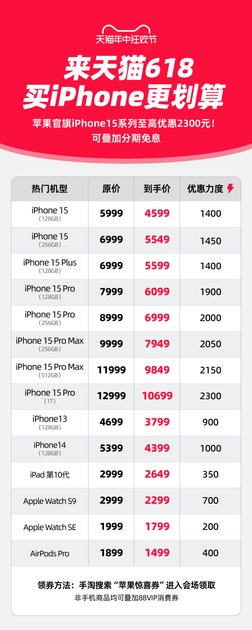 以原價(jià)5999元的128GB iPhone 15 為例,此次天貓618,官方立減1100元,可以疊加300元天貓?bào)@喜券,到手價(jià)僅4599元。iPhone 15 Pro 官方立減1600元后,疊加300天貓券,到手價(jià)6099元,還可享受3期分期免息。而且,通過(guò)以舊換新在天貓 Apple Store 官方旗艦店購(gòu)入新款iPhone還可再享受最多700元的舊機(jī)補(bǔ)貼。