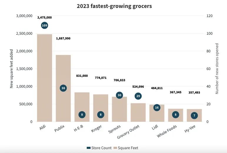 在仲量聯(lián)行JLL公布的2023年全美增速最快超市排名中,ALDI蟬聯(lián)第一。[1]