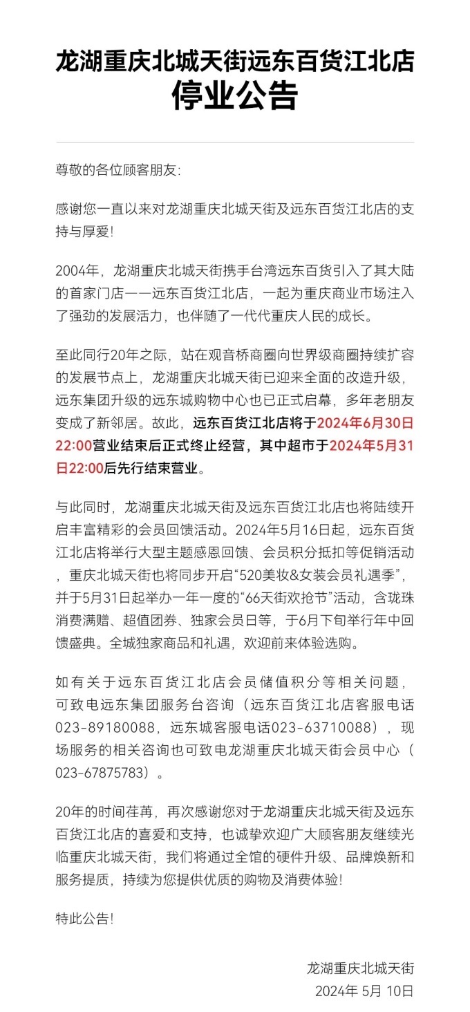 5月10日,龍湖重慶北城天街發(fā)布龍湖重慶北城天街遠(yuǎn)東百貨江北店停業(yè)公告。