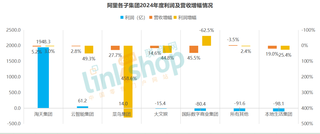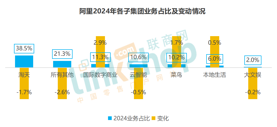 2024財年,各子集團的業(yè)務(wù)營收占比略有變動:國際數(shù)字商業(yè)集團增長2.9%、菜鳥集團增長1.7%,本地生活集團提升0.5%;而淘天集團和其他業(yè)務(wù)占比相對下降較大,大文娛2%的占比并且還在下降。整體看,這些結(jié)構(gòu)是內(nèi)部結(jié)果,更代表著阿里未來的資源走向,國際數(shù)字商業(yè)是未來期望,淘天業(yè)務(wù)占比有所下降,而其他業(yè)務(wù)只是相對穩(wěn)盤。