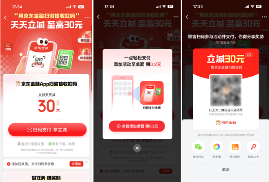 為便于日常使用,京東金融App還支持用戶將功能以快捷方式添加到手機桌面,隨時一鍵打開完成支付。不僅如此,在本次活動中,用戶添加桌面、完成支付、分享好友等動作都能收到真金白銀的現(xiàn)金補貼,最高可達到288元。
