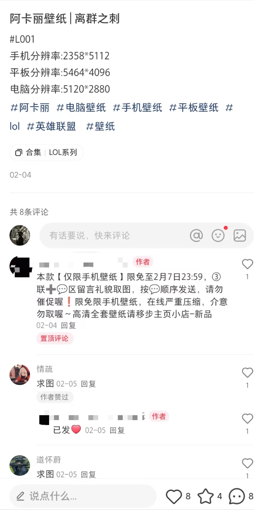 陸玖商業(yè)評論購買的手機(jī)壁紙為例,其具體變現(xiàn)方式如下:首先在筆記封面展示壁紙樣張,如果想要原圖,首先需要點(diǎn)贊收藏,還需要在評論區(qū)“求圖”,形式如下所示
