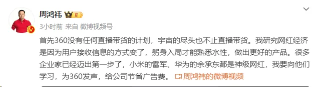 針對(duì)此消息,周鴻祎在微博談到,“宇宙的盡頭不止是直播帶貨。”他關(guān)注的是直播帶貨背后的短視頻直播的商業(yè)模式及網(wǎng)紅經(jīng)濟(jì)現(xiàn)象。