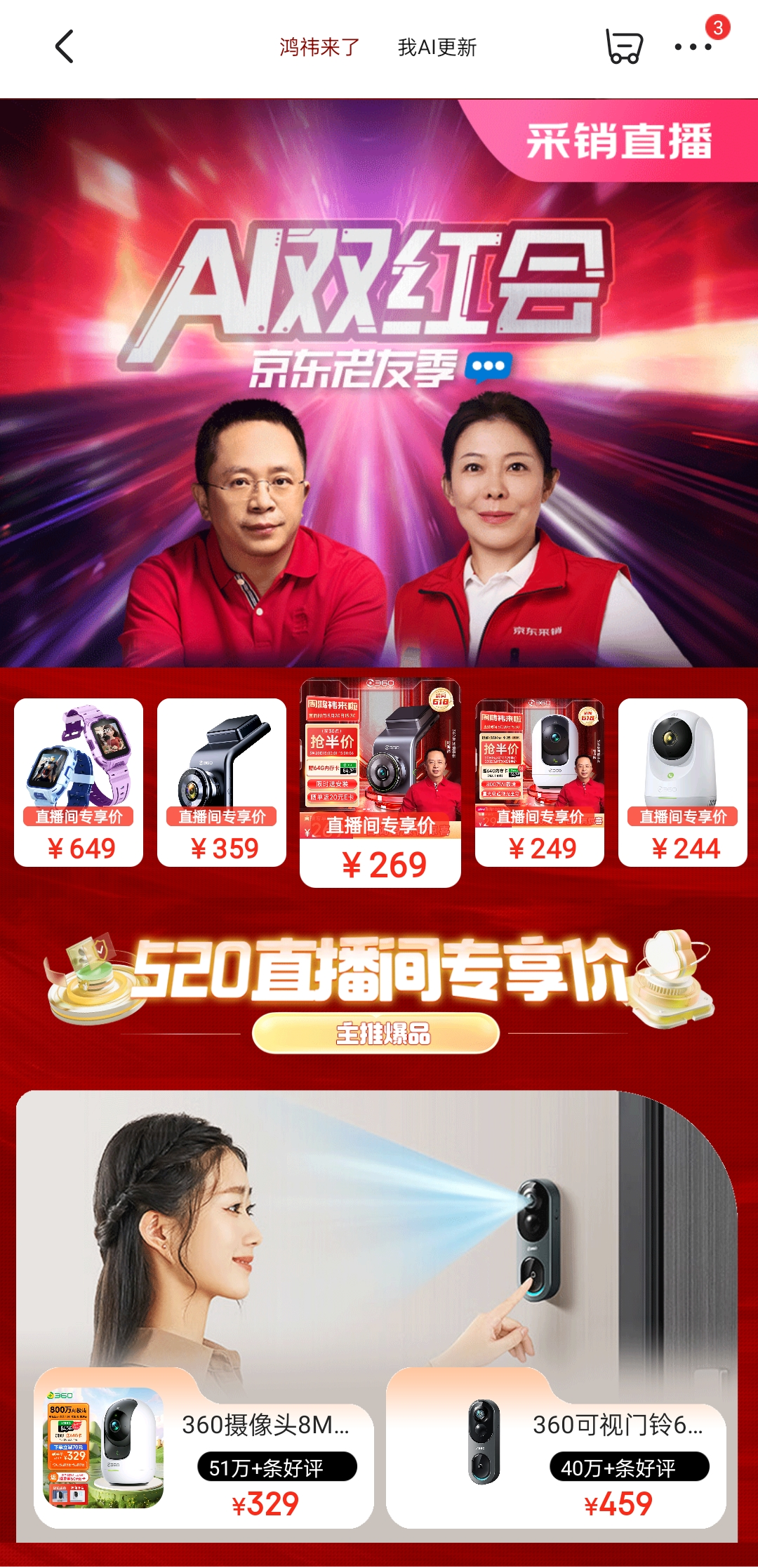 在京東總部線下商店看到360旗下的攝像頭、掃地機(jī)器人等產(chǎn)品時(shí),周鴻祎表示,在京東推銷自己的產(chǎn)品不屬于直播帶貨。