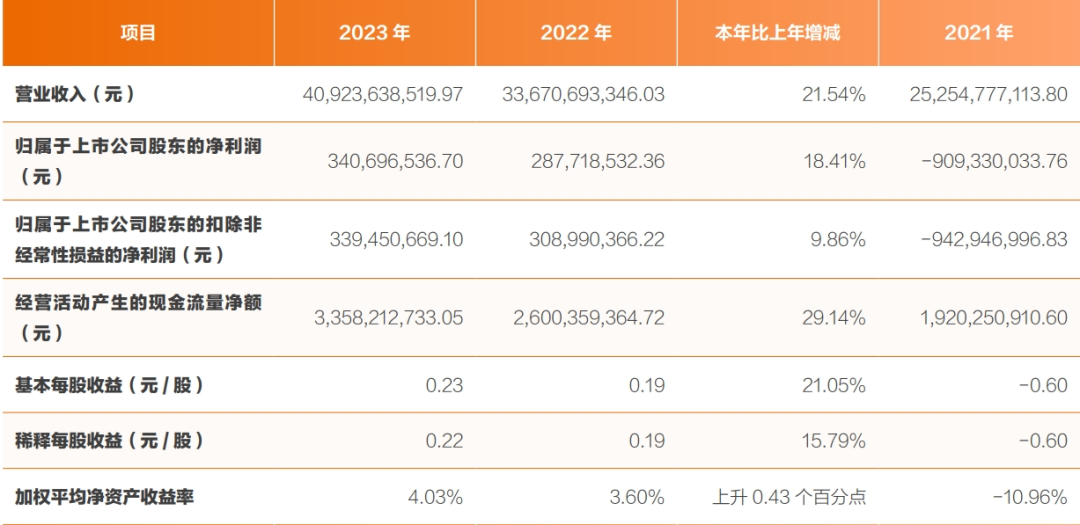 年報(bào)顯示,申通快遞2023年全年業(yè)務(wù)量175.07億件,同比增長(zhǎng)35.23%,高于行業(yè)增速15.8個(gè)百分點(diǎn);全年?duì)I業(yè)收入409.24億元,同比增長(zhǎng)21.54%;市場(chǎng)占有率達(dá)13.26%,同比提升1.55個(gè)百分點(diǎn),歸母凈利潤(rùn)3.41億元,較去年同期增長(zhǎng)18.41%。