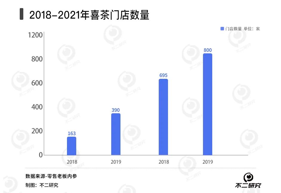 2018- 2021年,喜茶門店數(shù)量分別為163家、390家、695家和約800多家。