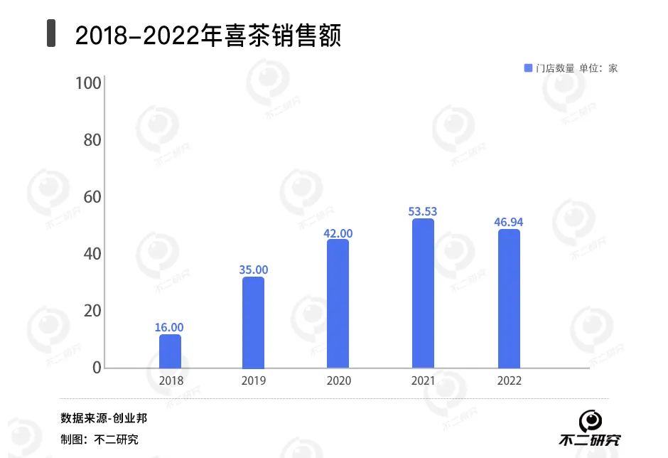 在創(chuàng)業(yè)邦一篇報道中,曾估算過喜茶的銷售額:2018-2021年,喜茶的銷售額分別為16.00億元、35.00億元、42.00億元、53.53億元,呈逐年上升趨勢。