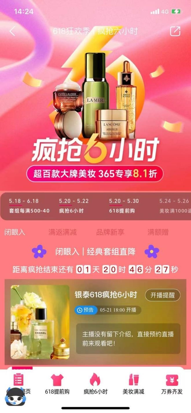 據(jù)悉,銀泰百貨618活動已于5月20日正式開啟,旗下線上平臺喵街“美妝爆品直降”活動打頭陣,開啟618第一波大促。