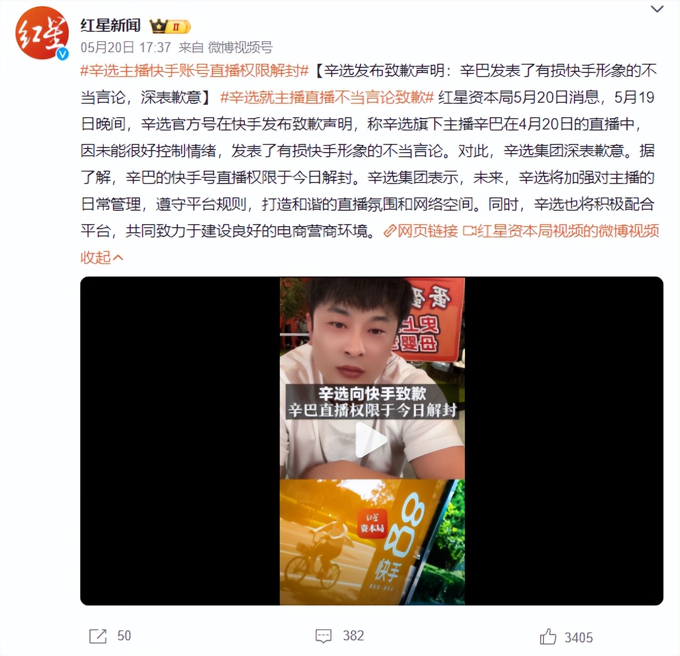 5月19日晚上,辛巴賬號(hào)被封禁近一個(gè)月后,辛選集團(tuán)在官方賬號(hào)上發(fā)布了一則道歉聲明,為旗下主播辛巴此前在直播中發(fā)表的有損快手形象的不當(dāng)言論道歉,并保證辛選未來(lái)會(huì)加強(qiáng)對(duì)主播的管理,與平臺(tái)一起建設(shè)良好的電商營(yíng)商環(huán)境。