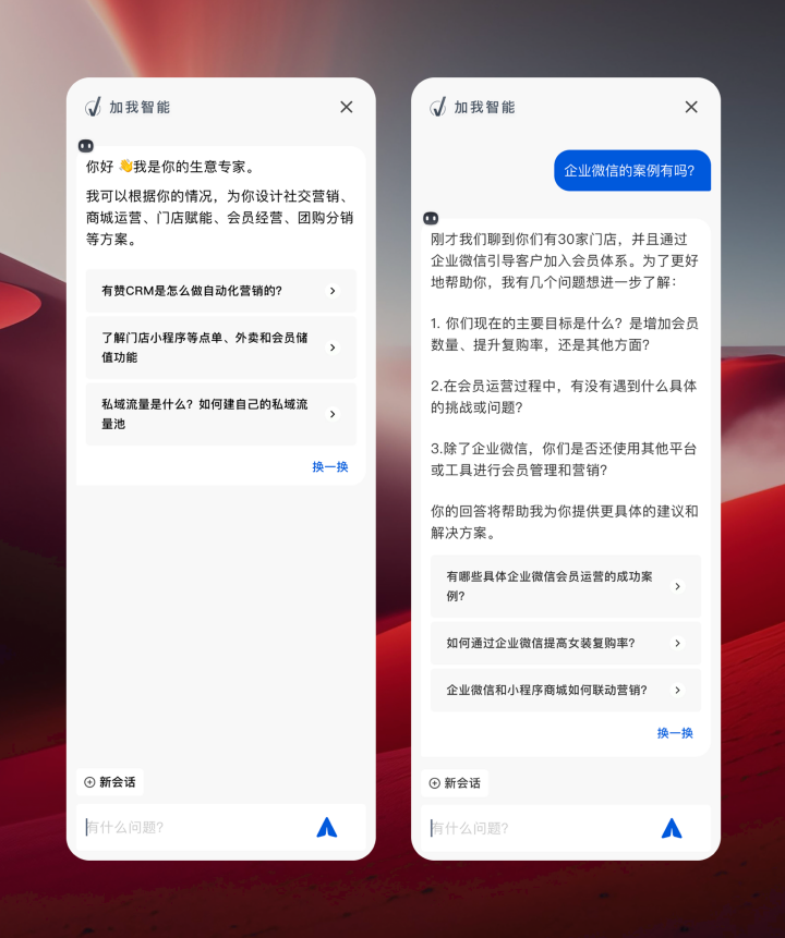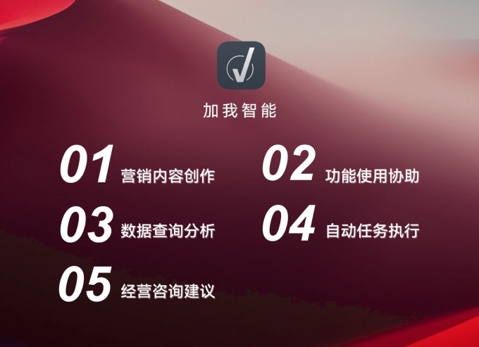 “AI技術(shù)的發(fā)展關(guān)鍵在于如何更好地融入業(yè)務(wù)場(chǎng)景,結(jié)合人工智能,改造作業(yè)流程,才能真正給用戶交付有用的結(jié)果,我們計(jì)劃開放更多結(jié)合場(chǎng)景的AI應(yīng)用!卑坐f透露,目前加我智能包含了五大核心應(yīng)用類型:營(yíng)銷內(nèi)容創(chuàng)作、功能使用協(xié)助、數(shù)據(jù)查詢分析、自動(dòng)任務(wù)執(zhí)行和經(jīng)營(yíng)咨詢建議。