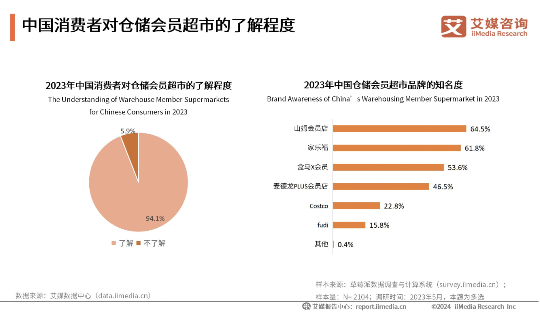 同時還有一項調(diào)研數(shù)據(jù)特別引起我們注意。調(diào)研數(shù)據(jù)顯示,94.1%的消費者了解倉儲會員超市,山姆會員店(64.5%)在國內(nèi)消費者的知名度最高,其次是家樂福(61.8%),盒馬x會員(53.6%)緊隨其后。