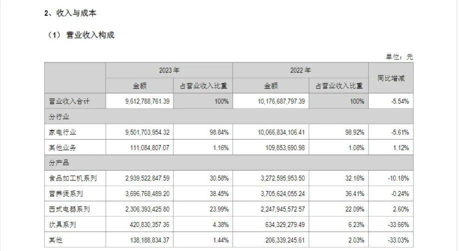 更關(guān)鍵的一點在于,九陽股份是已經(jīng)披露2023年業(yè)績的6家上市企業(yè)中,唯一一家營收與凈利潤雙降的企業(yè)。
