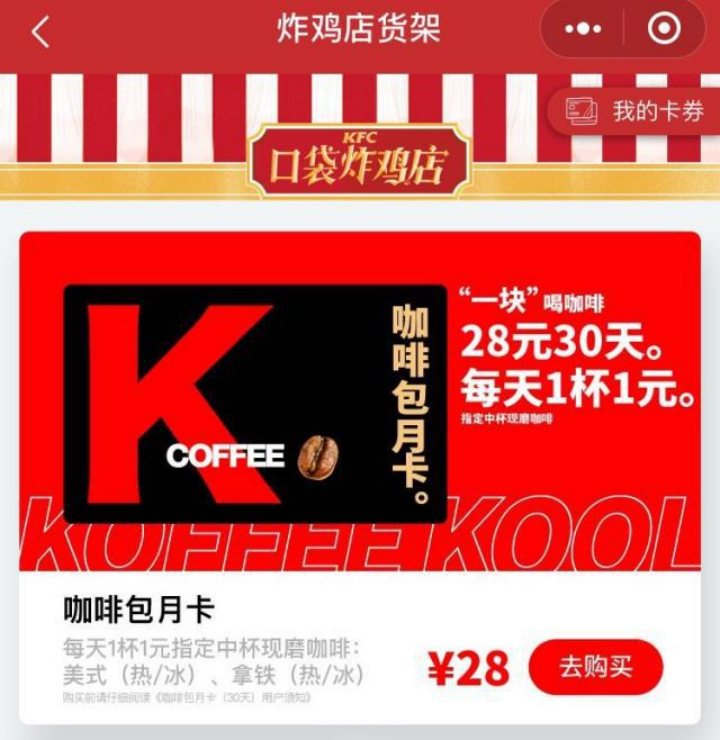 當(dāng)時(shí)處于低價(jià)地帶的KCOFFEE在還是小透明,作為肯德基吸引用戶到店,帶動(dòng)消費(fèi)的手段。2019年9月9日,肯德基宣布在中國市場推出售價(jià)28元的咖啡月卡,消費(fèi)者可以通過“肯德基口袋炸雞店”小程序購買,購買激活后的連續(xù)30天內(nèi)都能得到1杯中杯現(xiàn)磨咖啡,有拿鐵和美式兩種選擇。折算下來,每杯咖啡不到1塊錢。