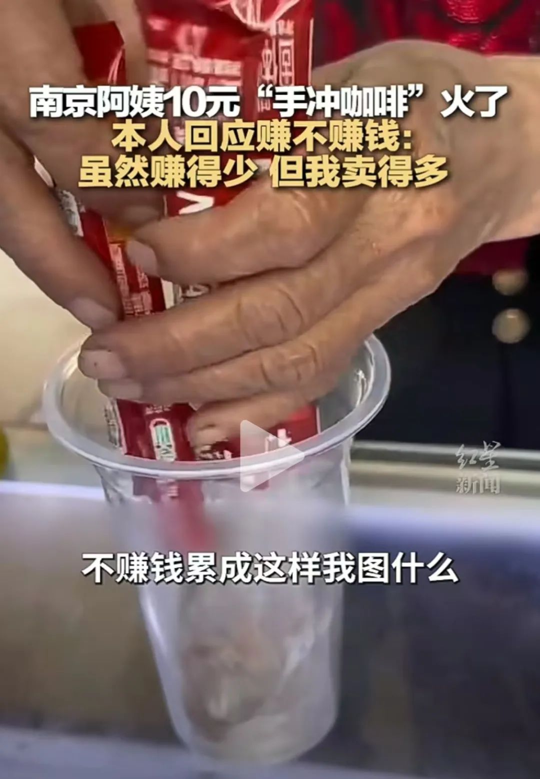 根據(jù)網(wǎng)上的報(bào)道,這位阿姨在南京街頭售賣10元一杯的“手沖雀巢咖啡”而走紅網(wǎng)絡(luò)。她的攤位以親民的價(jià)格和獨(dú)特的沖泡手法吸引了眾多市民和游客的關(guān)注。視頻里看到,使用的是普通的雀巢速溶咖啡粉,通過(guò)當(dāng)面沖泡的方式,給顧客帶來(lái)一種樸素而真實(shí)的咖啡沖泡體驗(yàn)。