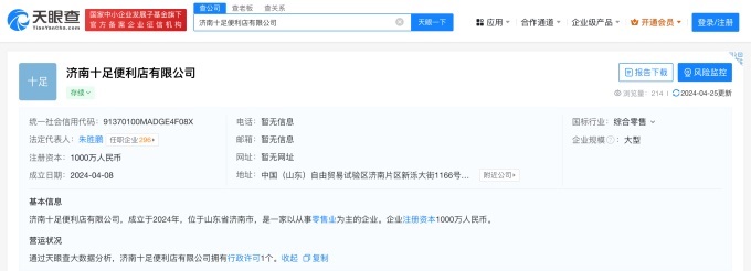 天眼查官網(wǎng)顯示,4月8日,濟(jì)南十足便利店有限公司在濟(jì)南注冊(cè)成立,法定代表人為朱勝鵬,注冊(cè)資本1000萬(wàn)元。股東信息顯示,該公司由十足集團(tuán)有限公司全資控股。