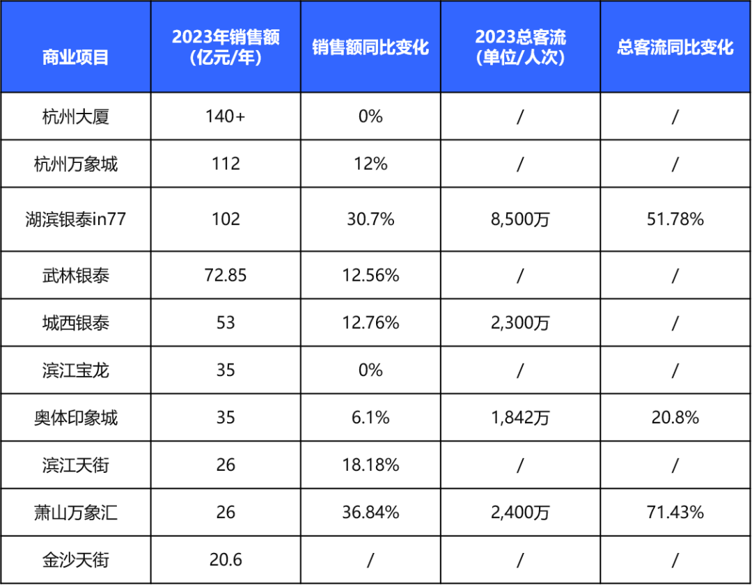 2023年杭州30大商場銷售額和客流情況 | 數(shù)據(jù)來源:聯(lián)商網(wǎng)