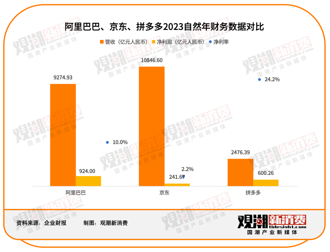 據(jù)財報數(shù)據(jù)顯示,阿里2023年全年收入達(dá)9274.93億元,同比增長7.28%;凈利潤同比增長166%至924億元;京東2023全年收入10847億元,同比增長3.7%,歸母凈利潤達(dá)241.67億元;拼多多2023全年營收為2476億元,同比增長90% ; 利潤達(dá)到600億元,同比增長90%。