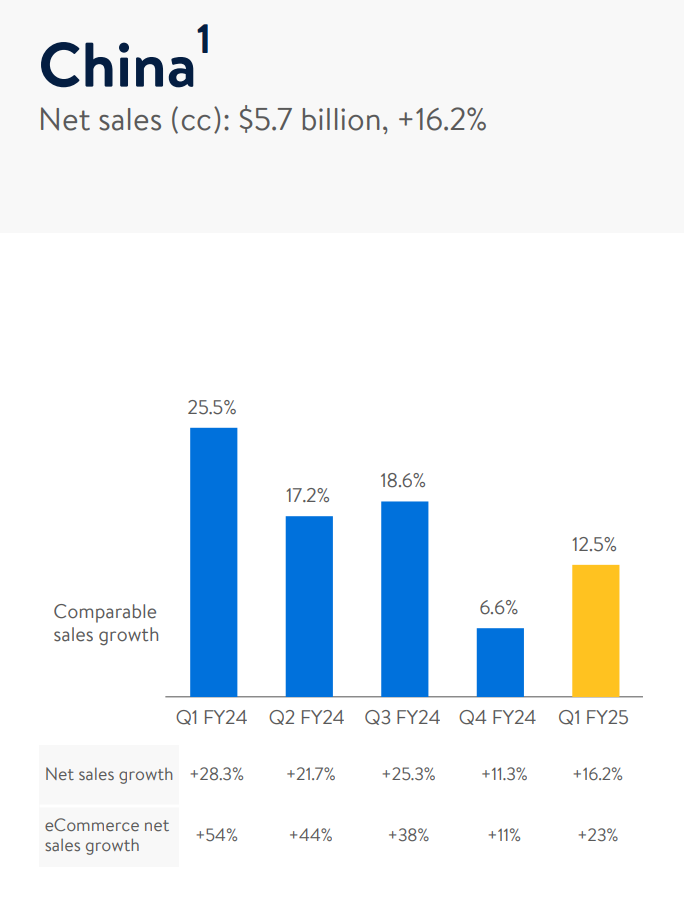 近年來(lái),中國(guó)市場(chǎng)成為了沃爾瑪國(guó)際業(yè)務(wù)領(lǐng)跑的重要推動(dòng)力。根據(jù)沃爾瑪2025財(cái)年第一季度最新財(cái)報(bào)數(shù)據(jù)顯示,沃爾瑪Q1總營(yíng)收為1615億美元,同比增長(zhǎng)6%,超出市場(chǎng)預(yù)期的1595.8億美元。沃爾瑪中國(guó)Q1凈銷售額為57億美元,同比增長(zhǎng)16.2%,可比銷售額增長(zhǎng)12.5%,該增長(zhǎng)主要由于山姆超市和沃爾瑪電商業(yè)務(wù)增長(zhǎng)強(qiáng)勁。