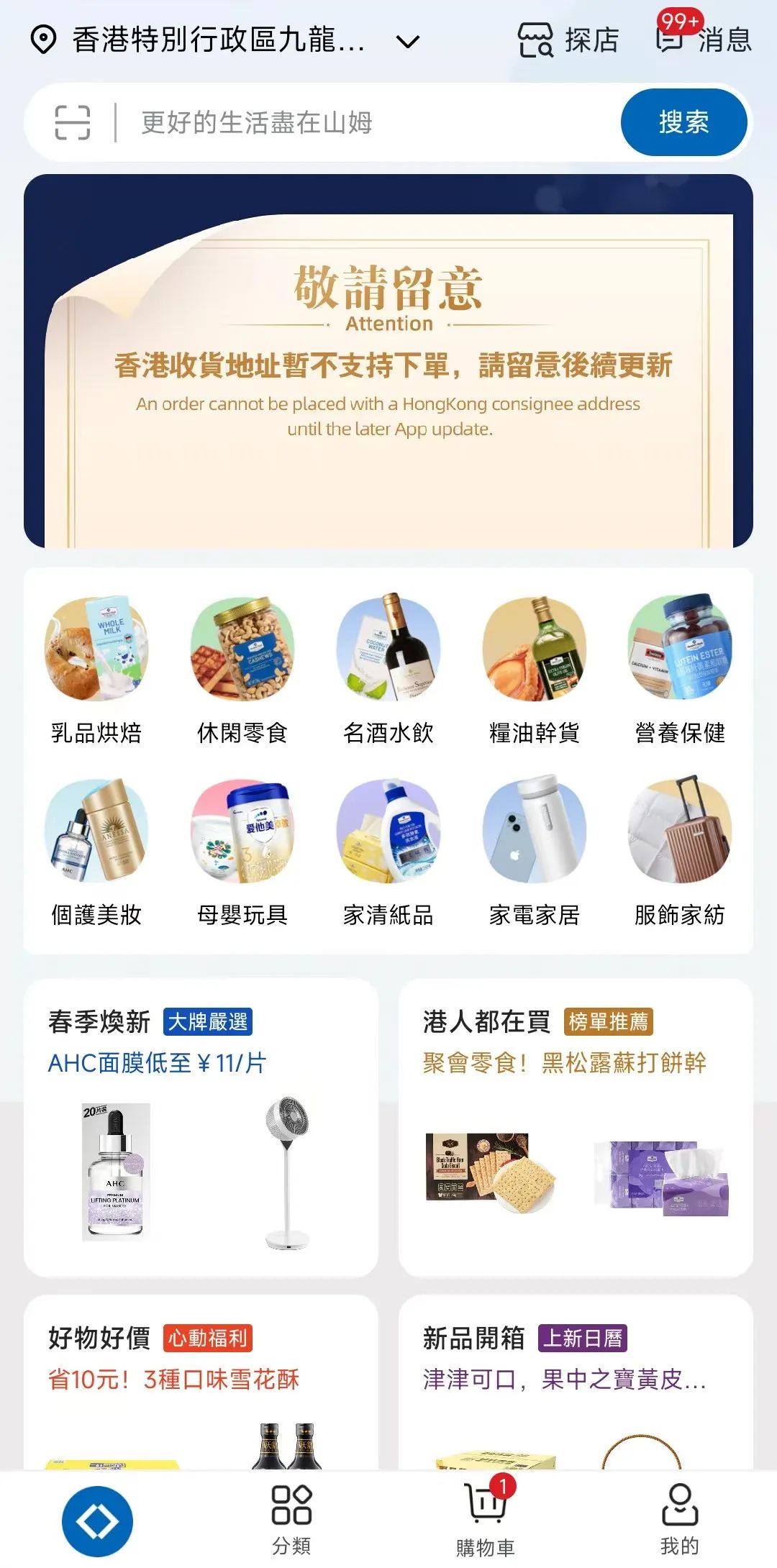 不過(guò),首頁(yè)公告欄顯示有“香港收貨地址暫不支持下單,請(qǐng)留意后續(xù)更新”的提示,雖然下單流程與山姆內(nèi)地版本的體驗(yàn)操作類(lèi)似,商品可加入購(gòu)物車(chē),但暫時(shí)還不能支付。