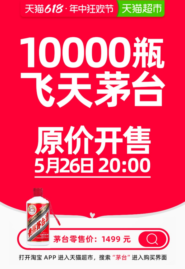 今晚8點(diǎn),天貓618放量10000瓶1499元飛天茅臺(tái)