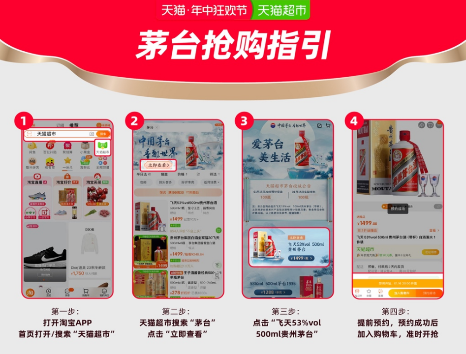 消費(fèi)者可以通過(guò)淘寶App進(jìn)入天貓超市,搜索“茅臺(tái)”進(jìn)入購(gòu)買(mǎi)頁(yè)面,點(diǎn)擊預(yù)約后商品變?yōu)榭杉淤?gòu)狀態(tài)就能加入購(gòu)物車(chē),晚上8:00即可準(zhǔn)時(shí)搶購(gòu),限購(gòu)規(guī)則不變,還是每人限購(gòu)2瓶。