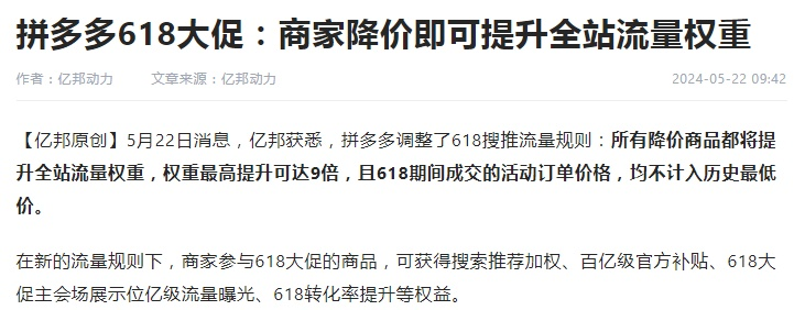 近日,拼多多調(diào)整618搜索推薦場景流量規(guī)則,商品排序上加大對活動商品和降價商品的流量加權(quán),所有降價商品都將提升全站流量權(quán)重,權(quán)重最高提升可達9倍,且618期間成交的活動訂單價格,均不計入歷史最低價。
