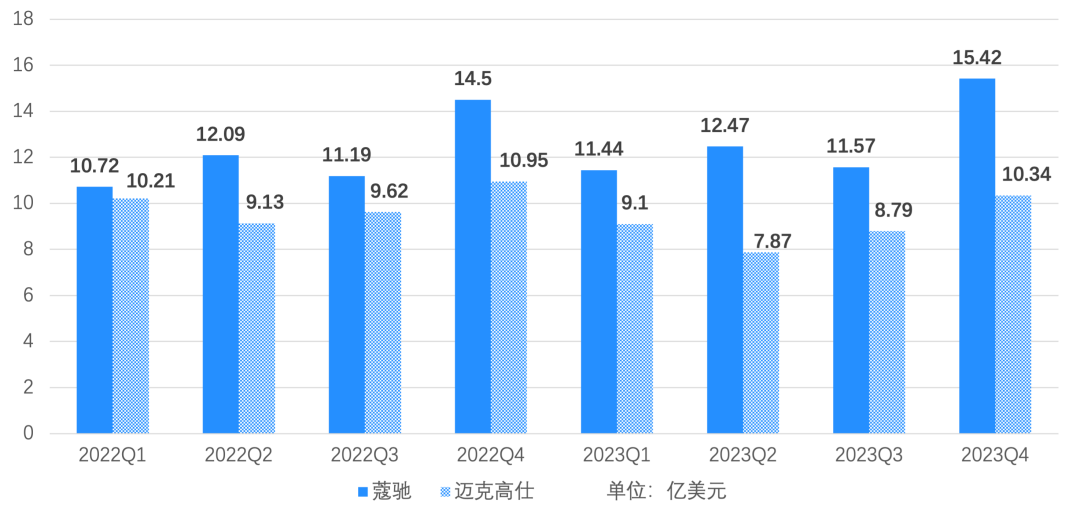 蔻馳、邁克高仕各季度銷售額,以自然年計