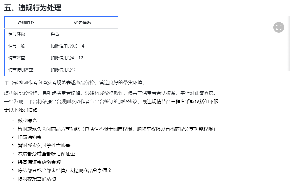 按照此前的處罰措施,一旦創(chuàng)作者進(jìn)行違規(guī)的價格宣傳,抖音電商將視違規(guī)情節(jié)的嚴(yán)重性,采取下架違規(guī)商品、扣除信用分、暫;蛴谰藐P(guān)閉商品分享功能等措施。