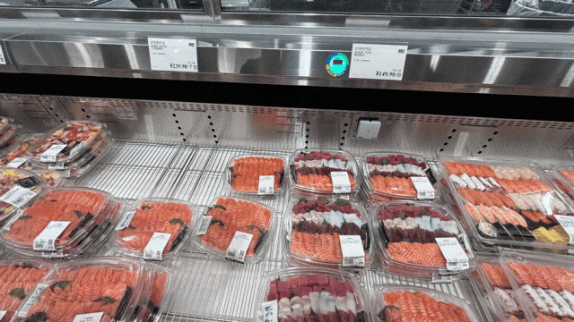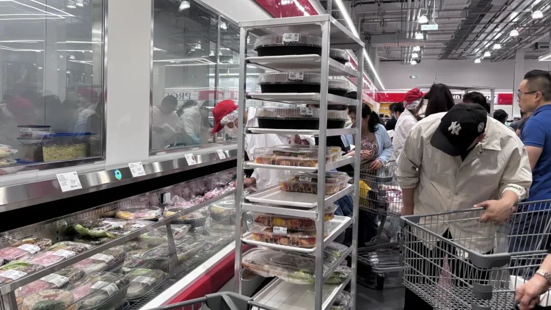 主要在哪里?主要就是人多。上午9點的Gostco生鮮熟食區(qū),是一道專屬開業(yè)日的“遺憾”風景線。那些看著就是最頂級的沙拉熟食,你就是擠不進去。時不時推著補貨車的員工還嚷嚷兩句:讓一讓、讓一讓。