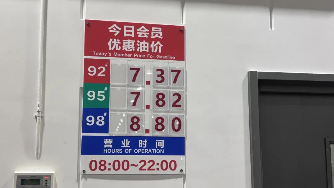 之所以會說Costco能讓顧客習慣加油,在于Costco的油價,真的便宜。今天店內(nèi)表示的油價:92號汽油7.37元/升;95號汽油7.82元/升。