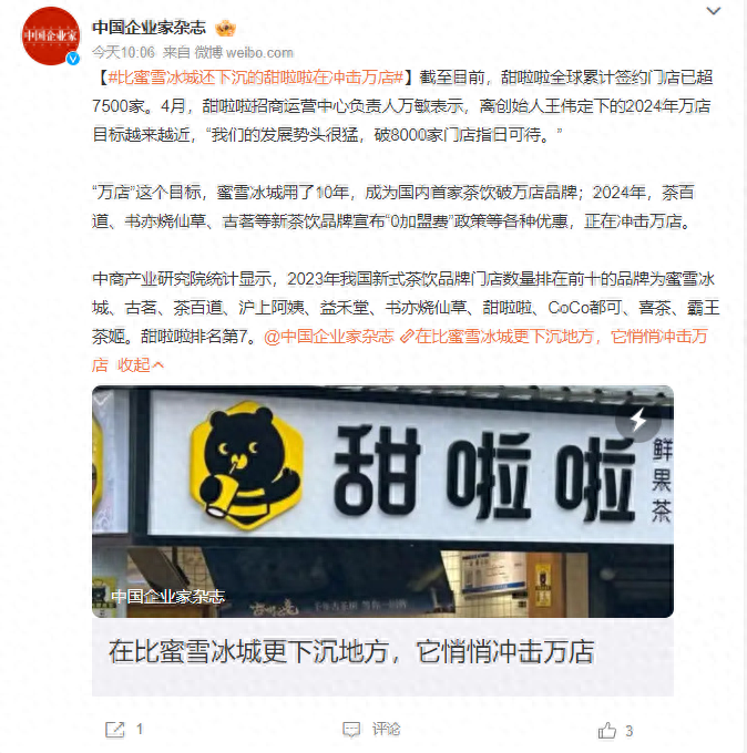 而甜啦啦,雖然沒有在名字上無限靠近蜜雪冰城,卻毫無疑問是踩在蜜雪冰城的肩膀上,一步一步走向了全國。2024年,甜啦啦又為自己定下了萬店目標,它能再次復制蜜雪冰城的成功嗎?