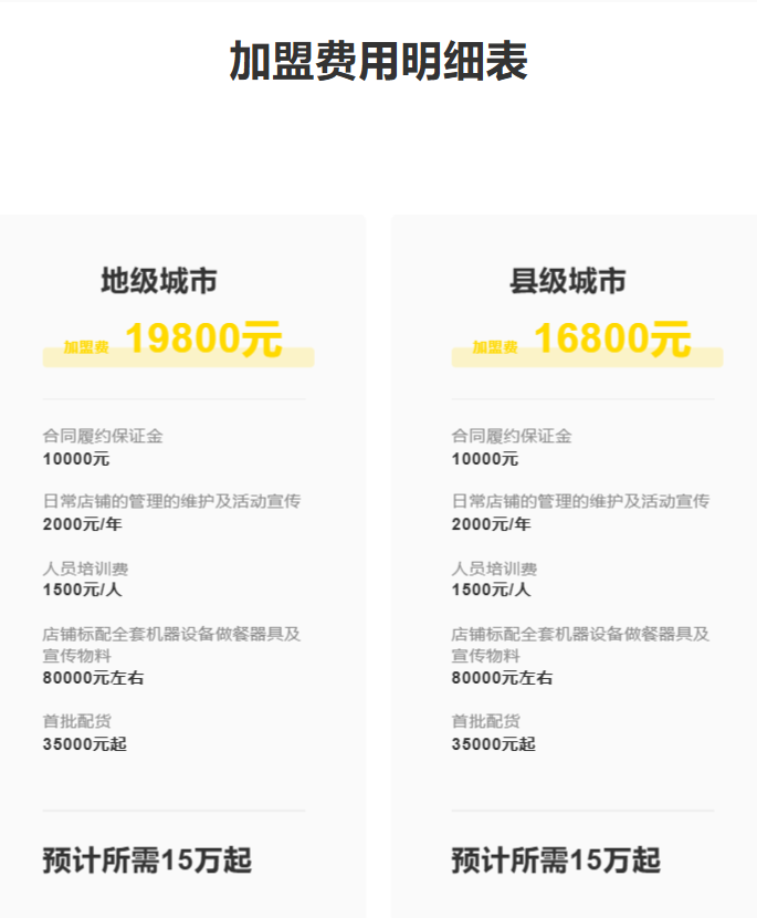 甜啦啦官網(wǎng)顯示,包括加盟費、合同履約保證金、店鋪維護及宣傳、人員培訓、設備及宣傳物料、首批配貨等所有費用在內,加盟一家甜啦啦預計需要15萬元以上,其中地級城市的加盟費為19800元,縣級城市的加盟費為16800元。相較于蜜雪冰城、茶百道等超過20萬元的費用,甜啦啦的費用確實不高。另外,甜啦啦對于新開店的加盟商還會給予補貼,最高80萬元的房租補貼,也超過其他品牌。