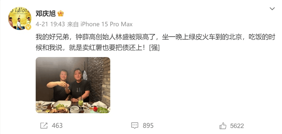 鄧慶旭曬出自己與林盛的合影,稱林盛被限高后,坐一晚上綠皮火車到了北京。“吃飯的時候和我說,就是賣紅薯也要把債還上!