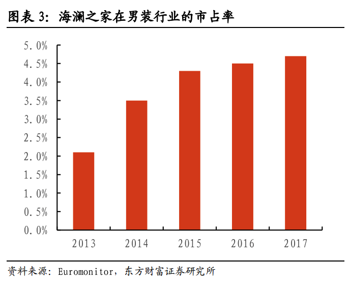 2003年以來,海瀾之家接連簽下吳大維、印小天、杜淳等當紅明星,并針對電視媒體大手筆投放聚焦男性消費者的廣告,一躍成為中國男裝品牌翹楚。東方財富披露的數(shù)據(jù)顯示,2014年,在中國男裝市場,海瀾之家的份額為3.5%,位列第一。