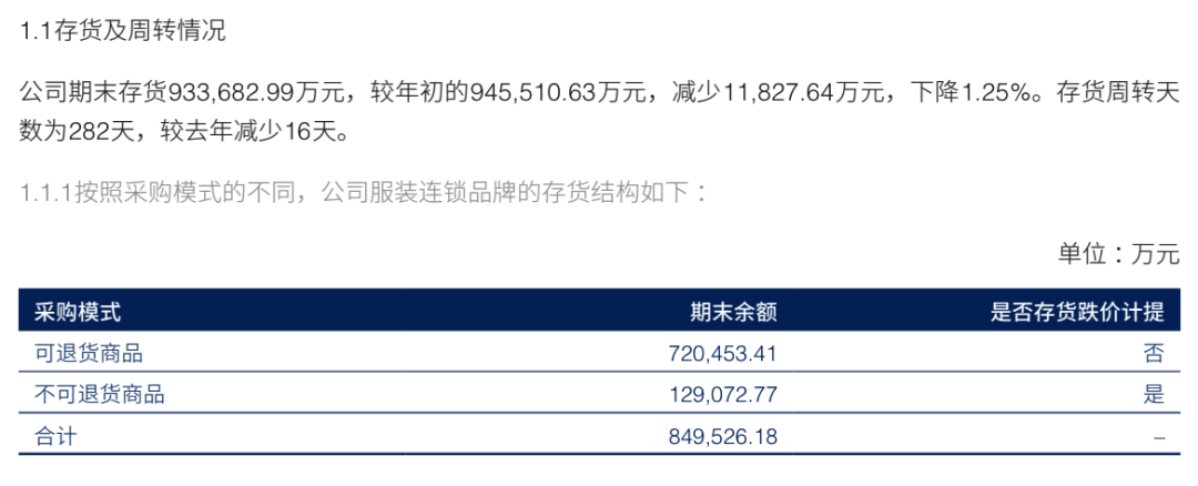 2023年財報顯示,海瀾之家采購合作模式包括不可退貨模式和可退貨模式?赏素浤J较拢懼遗c供應商簽訂附滯銷商品可退貨條款的采購合同,適銷季結(jié)束后仍未實現(xiàn)銷售的產(chǎn)品,可剪標后退還給供應商,由其承擔滯銷風險。