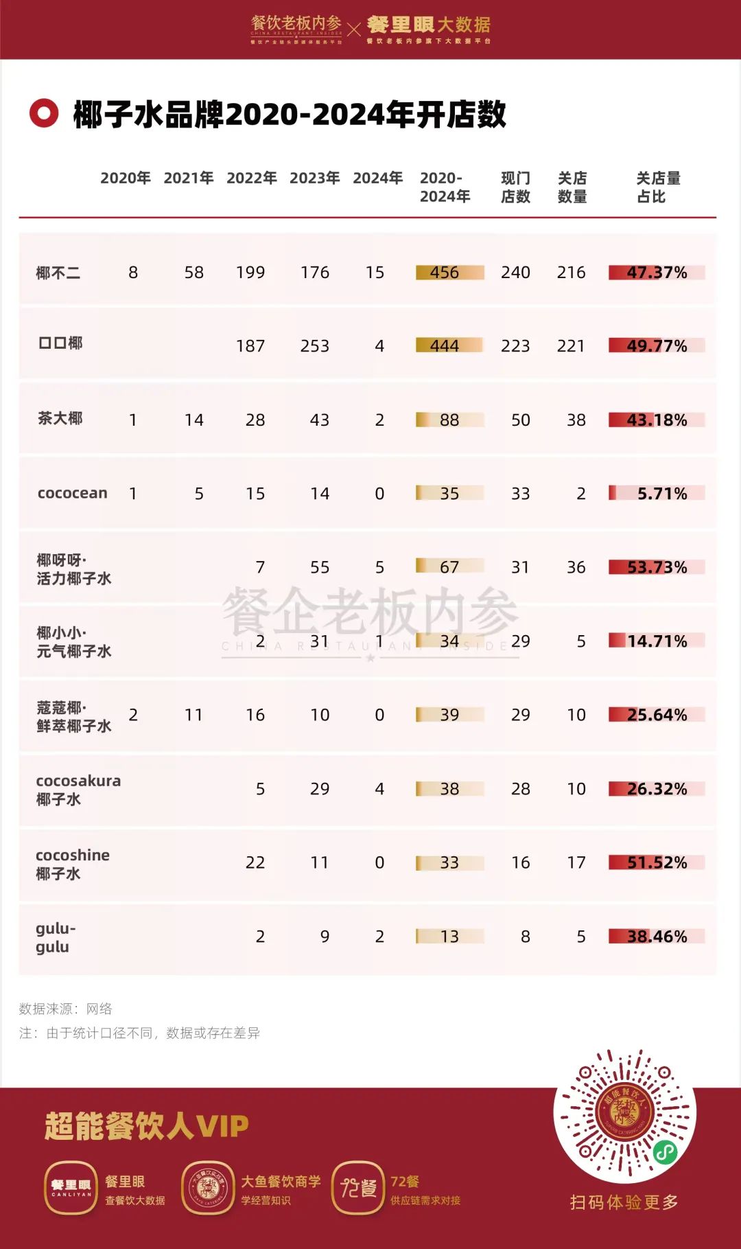 1、椰子水頭部品牌閉店率驚人。體量前十位的品牌,有半數(shù)的門店閉店率已接近50%,最高者甚至達(dá)到53.73%。