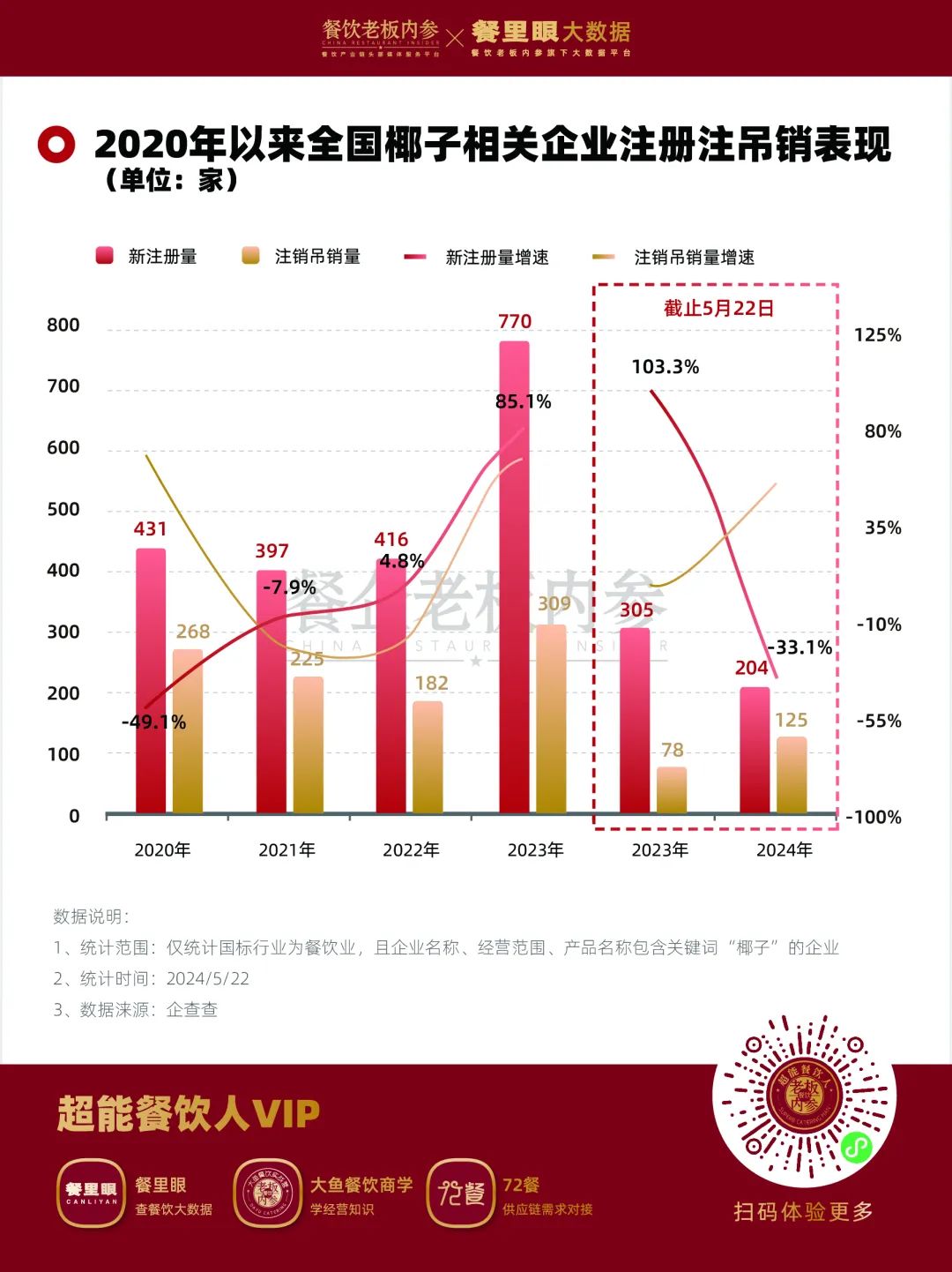 企查查數(shù)據(jù)顯示,和去年同期對(duì)比,椰子水相關(guān)餐飲企業(yè)新增量下滑,注銷量顯著增長。2024年1月1日至5月22日,共新增204家“椰子”相關(guān)餐飲企業(yè),新增量較去年同期降低33.1%;然而,2024年1月1日至5月22日,共注銷125家“椰子”相關(guān)餐飲企業(yè),注銷量較去年同期增加60.3%。