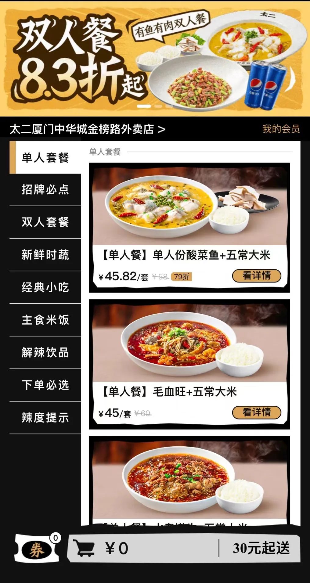 在產(chǎn)品上,這家外賣店保留了許多太二的經(jīng)典菜品,同時更聚焦單人餐和雙人餐,提高性價比。