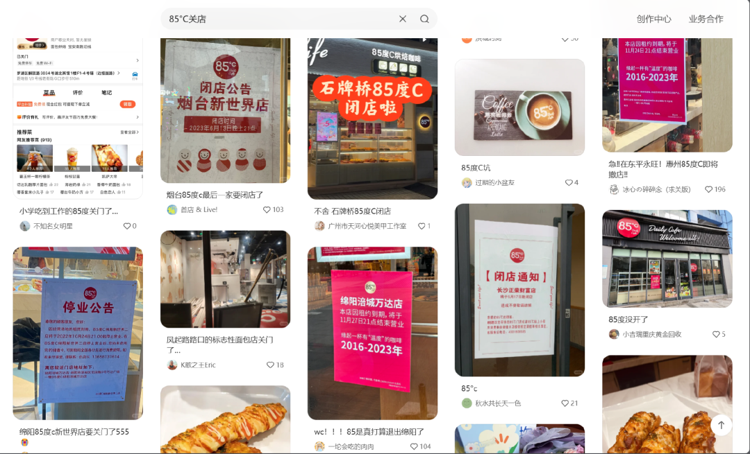 內(nèi)參君發(fā)現(xiàn),最近一年左右,在小紅書、大眾點評等多個社交平臺出現(xiàn)了大量“緬懷”85℃的帖子。在全國各地,都有85℃的老店正在關(guān)閉撤離。
