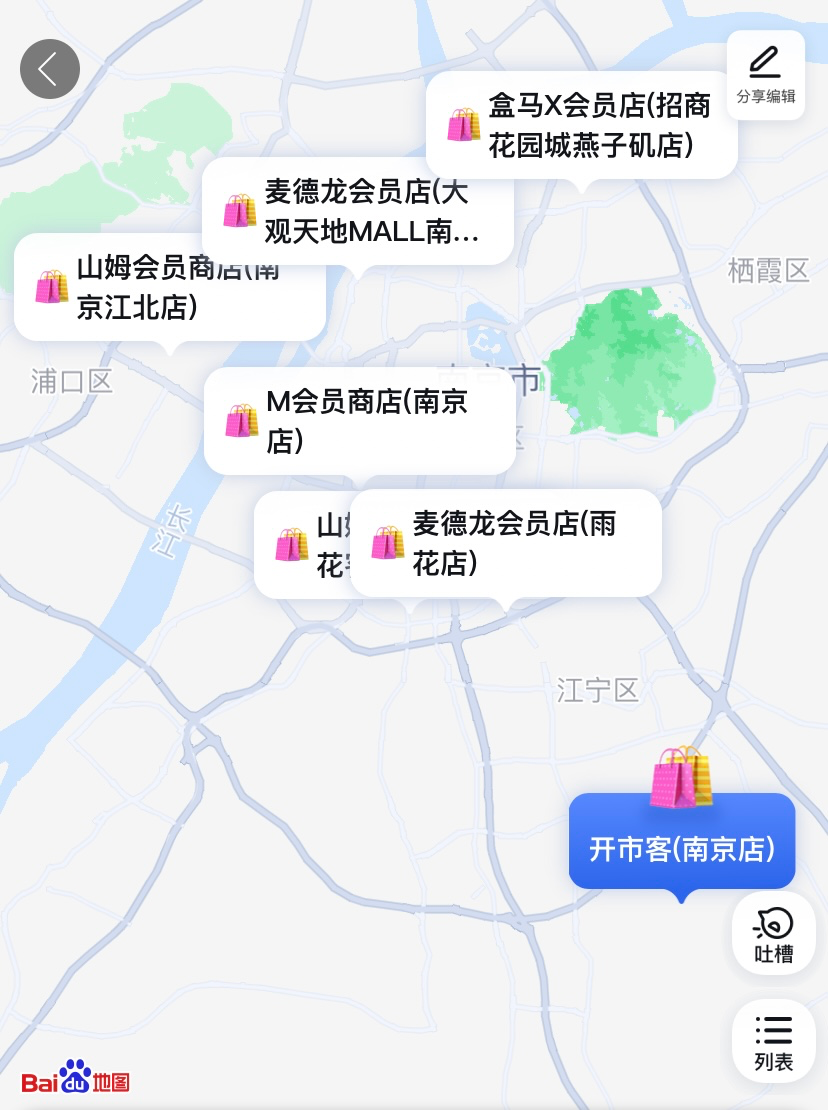 從門店選址來看,各大會員店整體分布還算均衡,Costco位于江寧區(qū),山姆會員商店位于江北新區(qū),M會員商店位于建鄴區(qū),麥德龍(大觀·天地店)位于鼓樓區(qū),盒馬X會員店位于棲霞區(qū),僅山姆會員店(雨花客廳EPARK店)和麥德龍(南京雨花店)距離較近。
