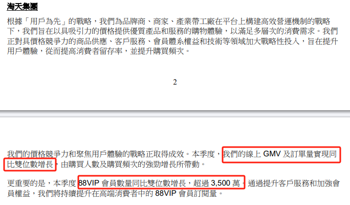 淘天的交易額和訂單量均實現(xiàn)了兩位數(shù)的增長,電商板塊勢頭強勁。同時88VIP會員群體數(shù)量突破3500萬,用戶粘性和忠誠度均有提升。
