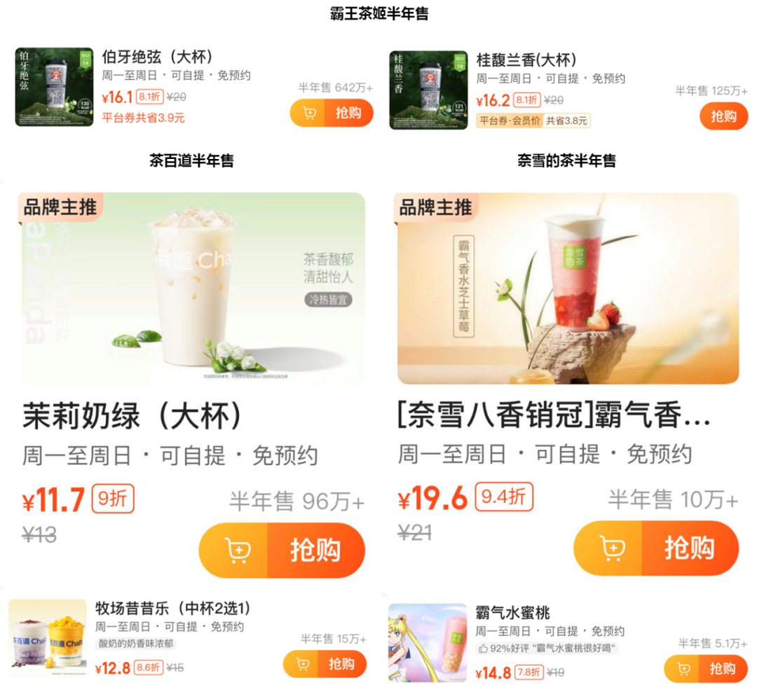而奈雪的茶同期“半年售”數(shù)據(jù)顯示,“霸氣香水芝士草莓”超10萬(wàn),“霸氣水蜜桃”為5.1萬(wàn)。