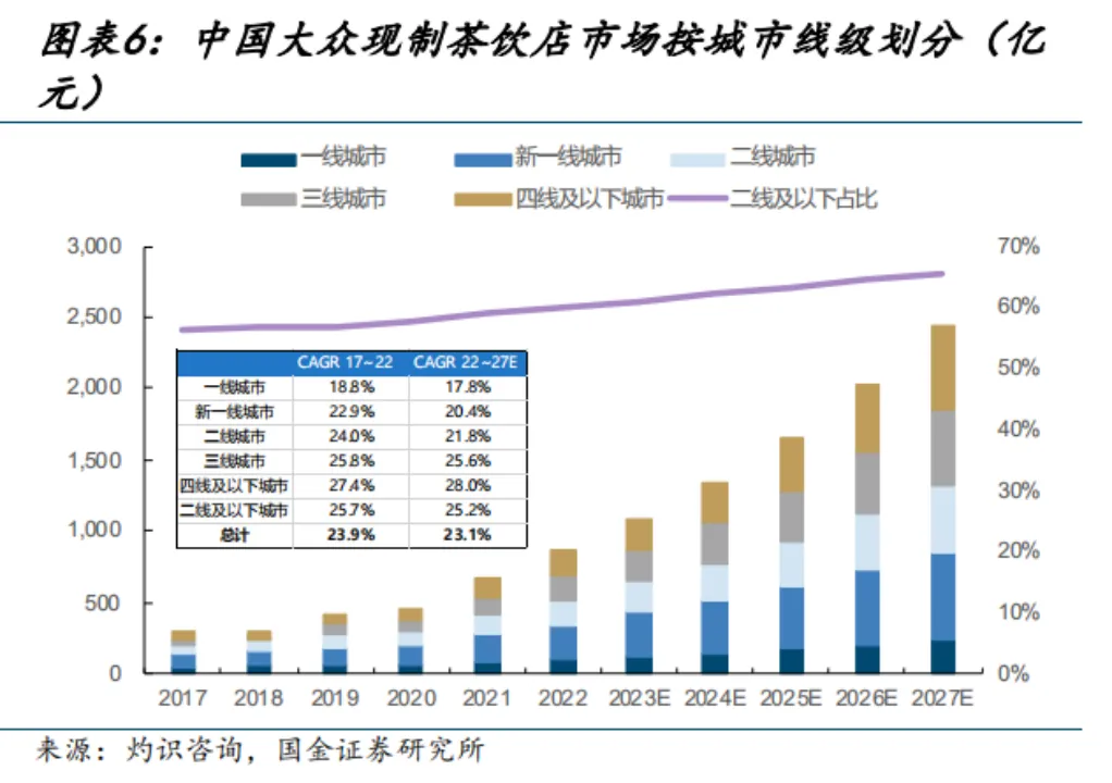 據(jù)灼識(shí)咨詢數(shù)據(jù),2017年至2022年,三線及以下城市市場(chǎng)復(fù)合年增長(zhǎng)率達(dá)30.2%,從2017年的196億元擴(kuò)大至2022年的732億元。2023年,三線及以下城市市場(chǎng)增速預(yù)計(jì)達(dá)31.4%,未來(lái)兩年增速仍將保持在20%以上。