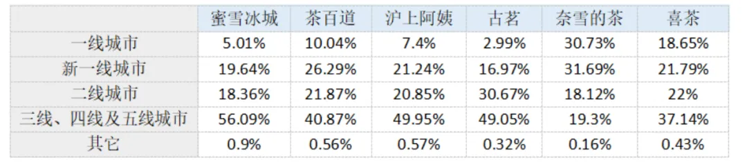 根據(jù)蜜雪冰城招股書(shū),截至2023年9月,其門店總數(shù)達(dá)到3.6萬(wàn)家。其中,三線及以下城市有1.8萬(wàn)家店,占全國(guó)總數(shù)的56.9%。作為對(duì)比,同期滬上阿姨的門店數(shù)占比為49%,茶百道的比例還要更低。