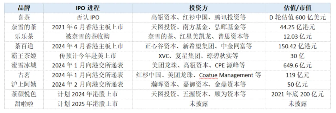 36氪不完全統(tǒng)計(jì),截至發(fā)稿前,已有包括蜜雪冰城、古茗、霸王茶姬在內(nèi)的9家頭部企業(yè)向資本市場(chǎng)遞交招股書(shū)或被傳出有上市計(jì)劃。