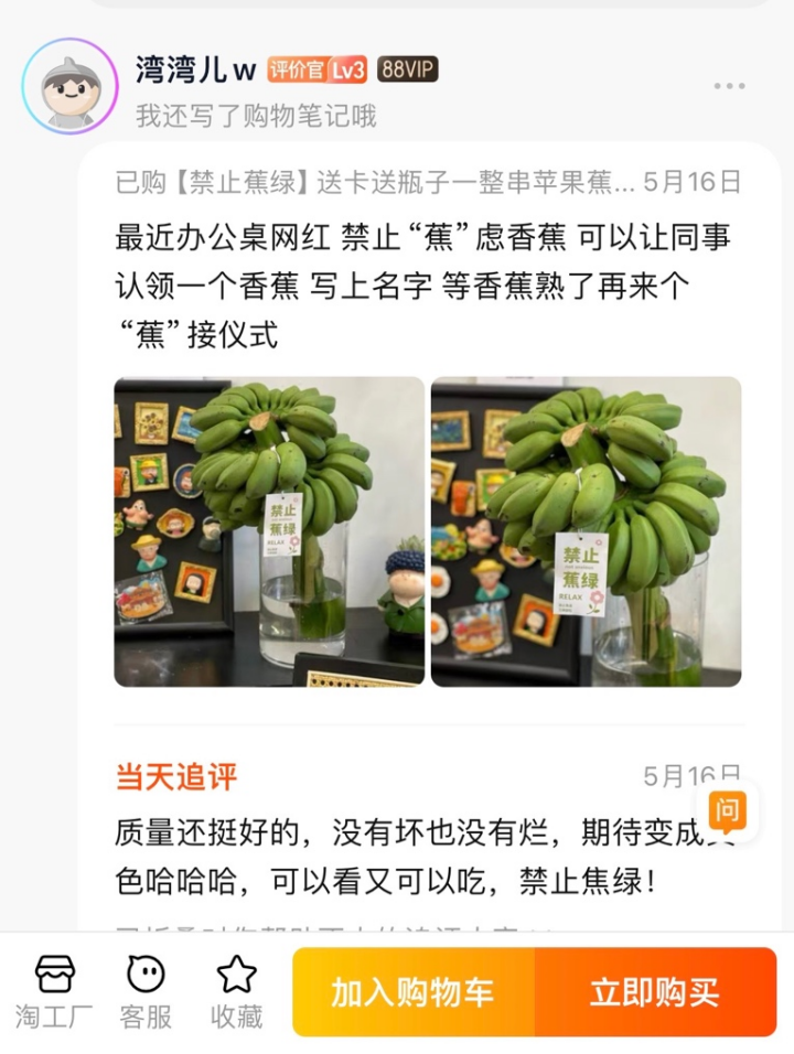 在“品品鮮”淘工廠店鋪消費(fèi)者評(píng)價(jià)區(qū),不到3個(gè)月,就積累了1萬多條消費(fèi)者評(píng)價(jià)。例如,“讓同事寫上名字認(rèn)領(lǐng)一個(gè),等熟了再來個(gè)‘蕉’接儀式”、“家里有兩只貓,養(yǎng)不了花養(yǎng)水果也是一樣的”、“可以給孩子看看香蕉成熟的變化也很有趣”……